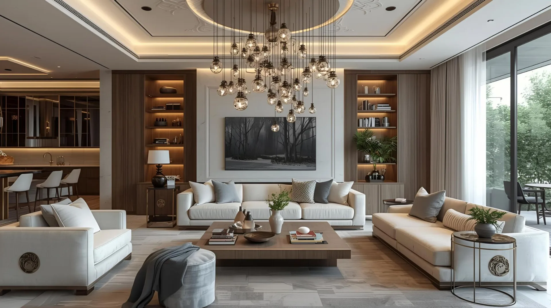 False ceiling, wall treatments, lighting, furniture, décor, and layout styling.