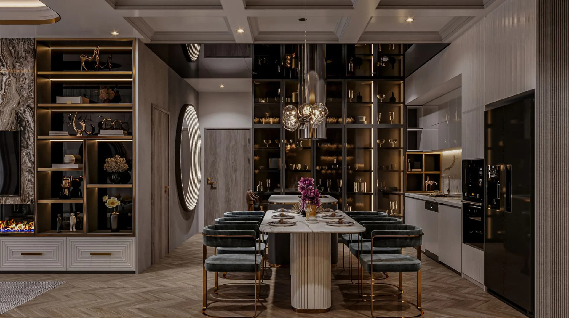 False ceiling, wall treatments, lighting, furniture, décor, and layout styling.